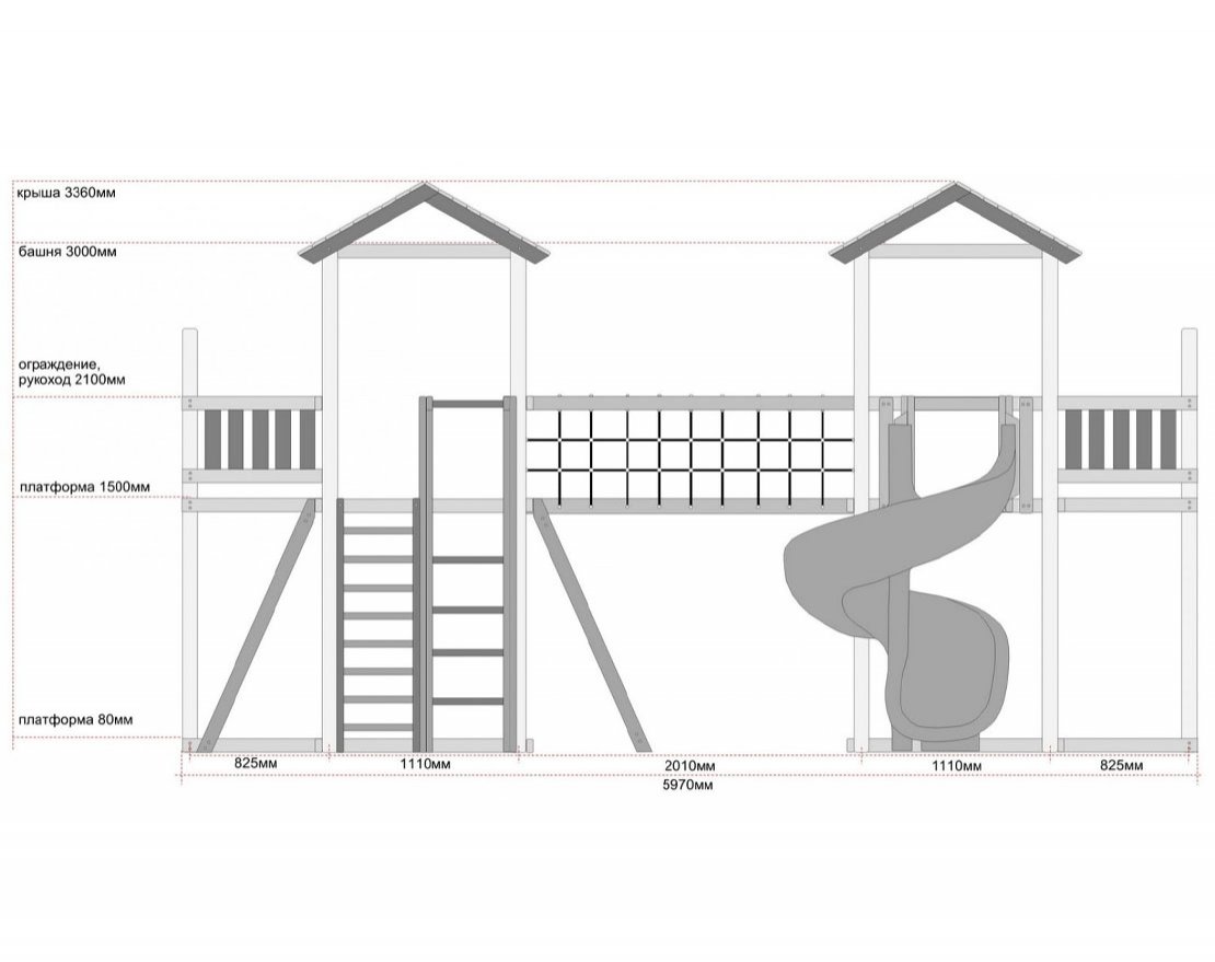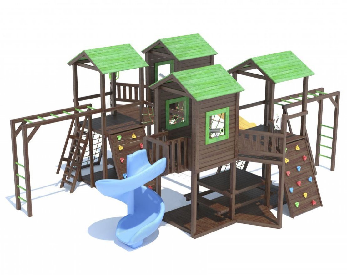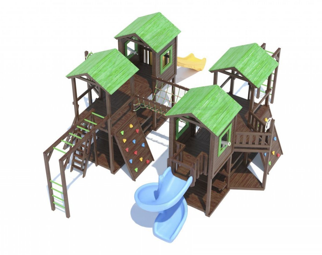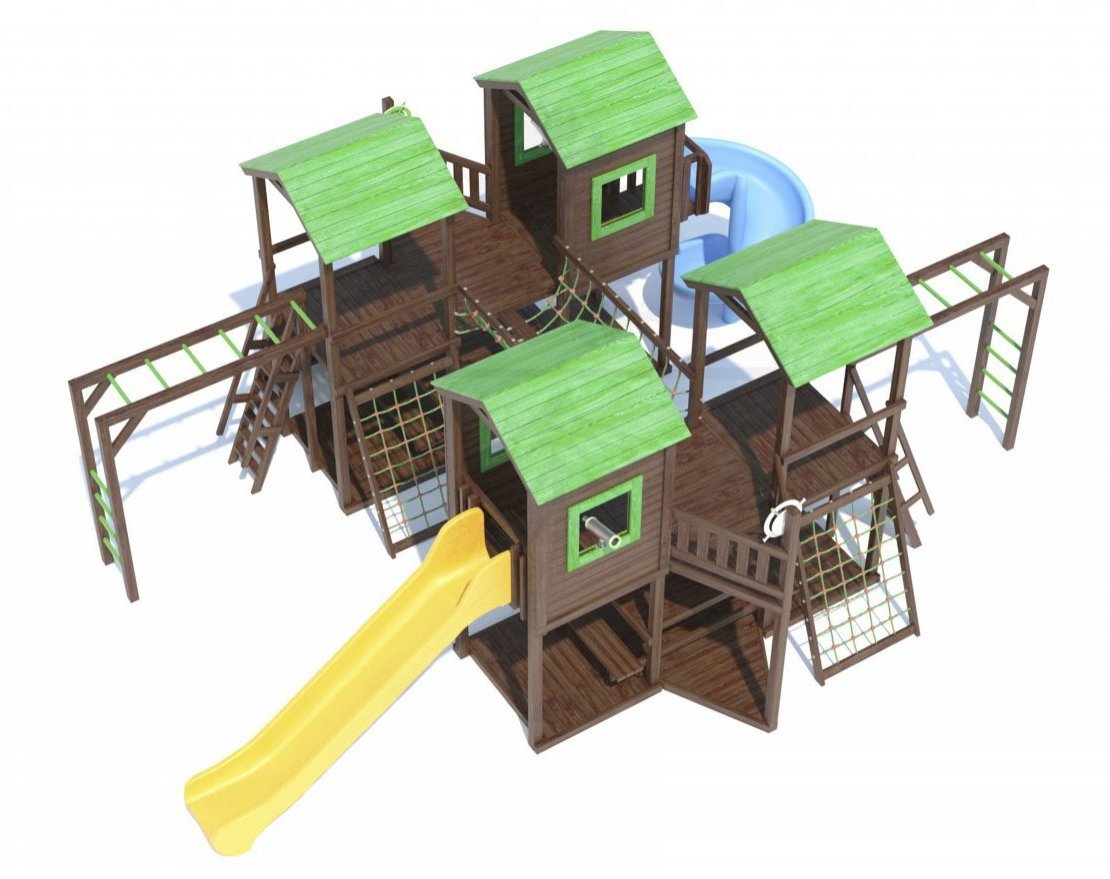Основа детской игровой - спортивной конструкции – четыре башни с мостами и балконами «серия J». Конструкция оснащена четырьмя двухскатными деревянными крышами, встроенным полом, двумя встроенными домиками в верхней части конструкции, двумя встроенными столиками с лавками в нижней части конструкции, пластиковым антивандальным скатом с превосходной скользящей поверхностью, антивандальным винтовым скатом с переходным мостиком, двумя «П»-образными деревянными рукоходами, скалодромом, канатной лестницей с армированным канатом, двумя деревянными лестницами, антивандальными штурвалами и телескопами. Для безопасности ребенка предусмотрены перила на лестнице, заборчики и ограждения над зонами препятствий (скат).