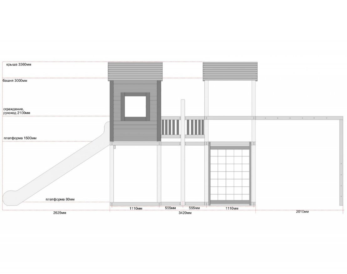 Рекомендованная распределенная единовременная нагрузка: игровая платформа 350кг., канатный мост 150кг., деревянная лестница 100кг., скалодром 150кг., канатная лестница 150кг., рукоход 150кг, столик с лавочками 200кг., скат 150кг.