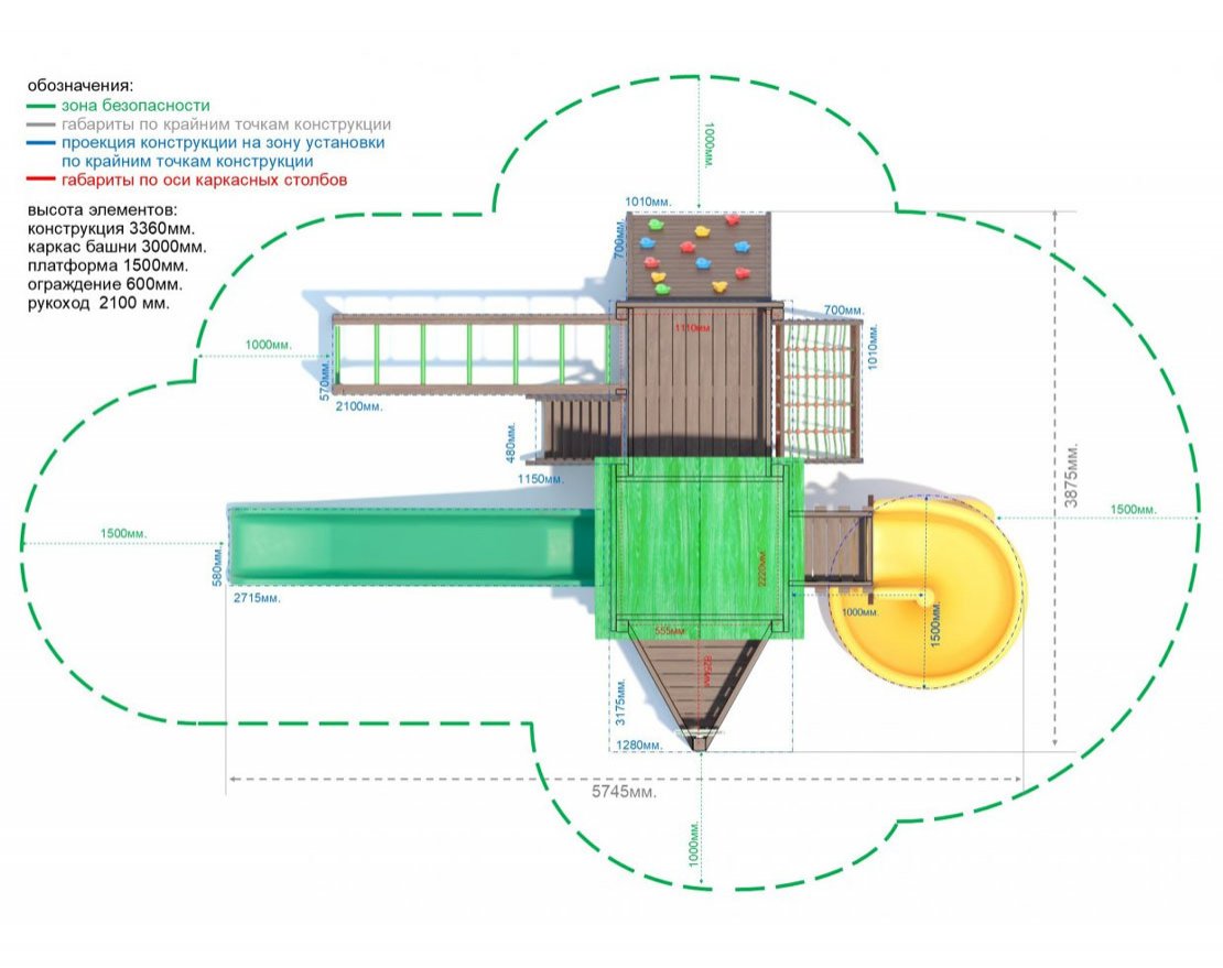 Для безопасной эксплуатации конструкции, площадка должна быть свободна от зеленых насаждений, сооружений и других конструкций, ровная, без перепадов уровня, без впадин и насыпей. Габариты площадки с учетом зоны безопасности длина 8745мм. ширина 5875мм., площадь площадки S-51,4м². Запрещено устанавливать конструкцию в зонах с повышенным риском провалов в грунте (болотистая местность, береговая линия водоемов, в непосредственной близости с оврагами и обрывами).
