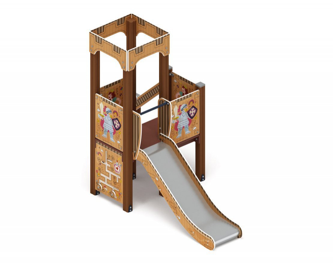 Спаренная башня из шести клеёных брусьев 100х100 мм, высота 2500 мм — 4 шт. и 1500 мм — 2 шт.; полы из ламинированной фанеры, с антискользящим покрытием 780х780 мм и толщиной 18 мм. Башня без крыши, украшена стилизованными декоративными арками, кромки фанеры тщательно шлифованы, окрашены с нанесением принта. Отметка пола башни от планировочной отметки площадки 900 мм и 750 мм.