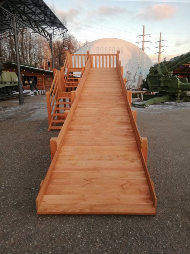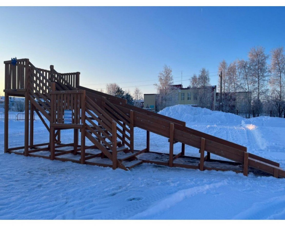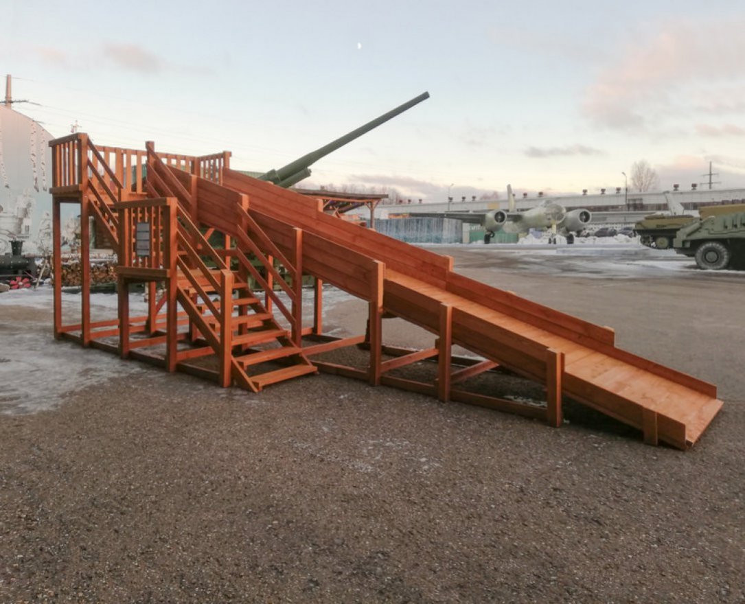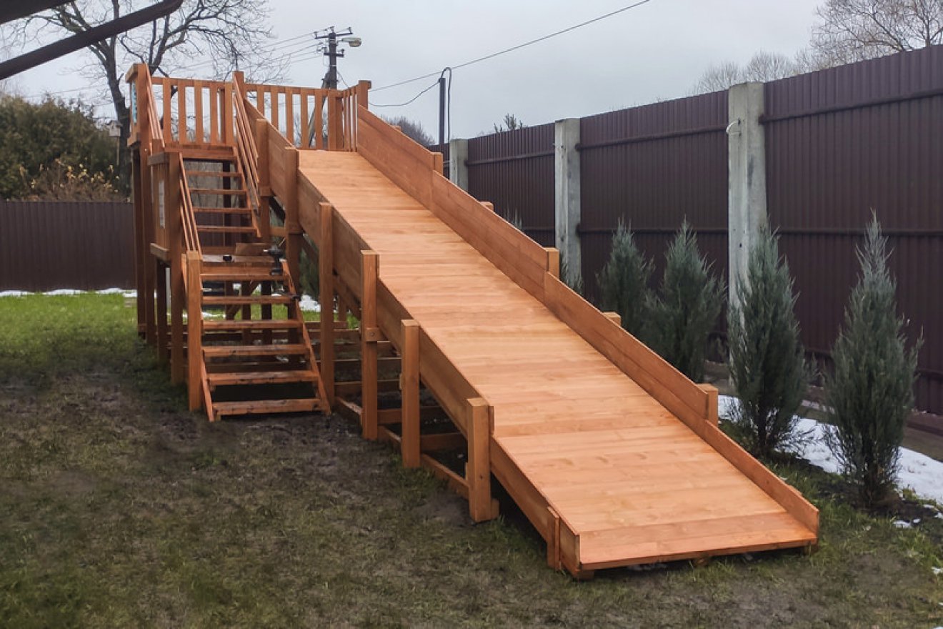 Для подъёма вверх конструкция оснащена лестницей и перилами. Рекомендуется каждый день очищать ступеньки от снега, чтобы на них не натаптывались ледышки, подвергающие детей опасности.