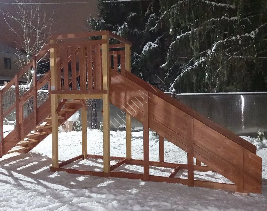 Каркас зимней горки сделан из прочного клееного бруса. Может эксплуатироваться в любую погоду и служить при этом в течение долгих лет, сохраняя форму. От осадков материал защищен лакокрасочным покрытием на натуральной основе. Вся элементы модели сертифицированы и соответствует ГОСТ (Декларация ТР ЕАЭС 038).