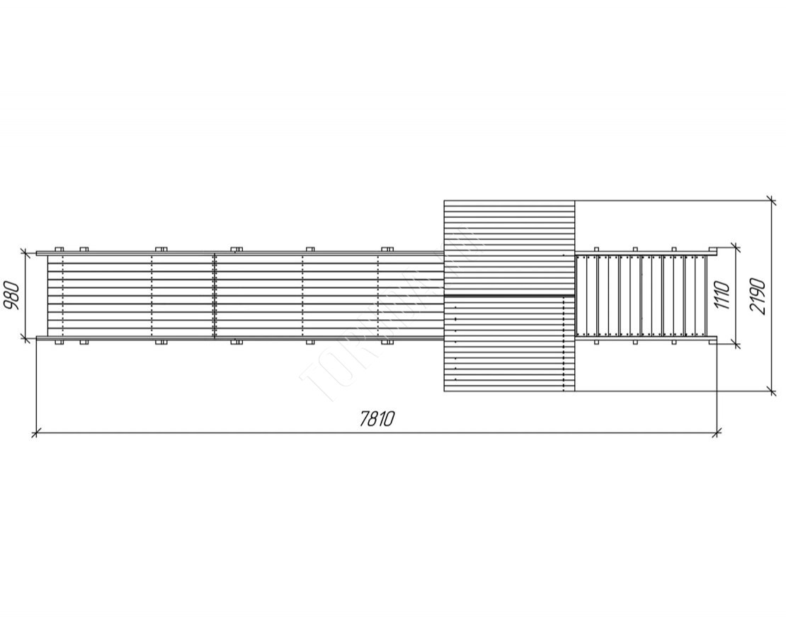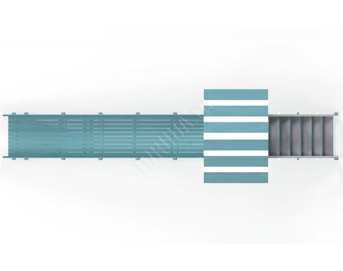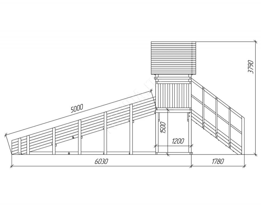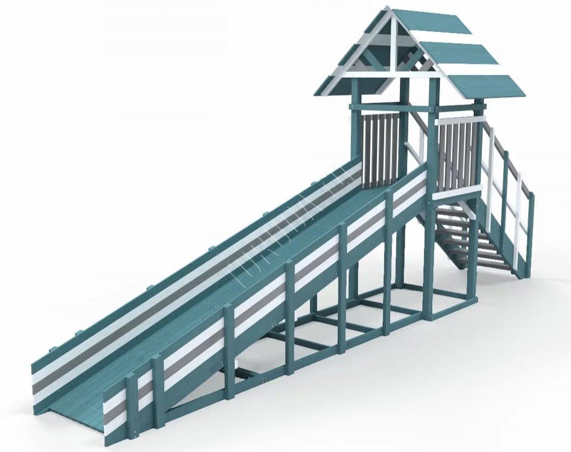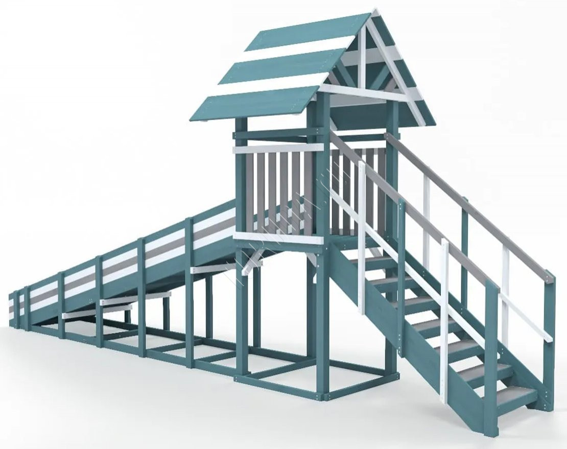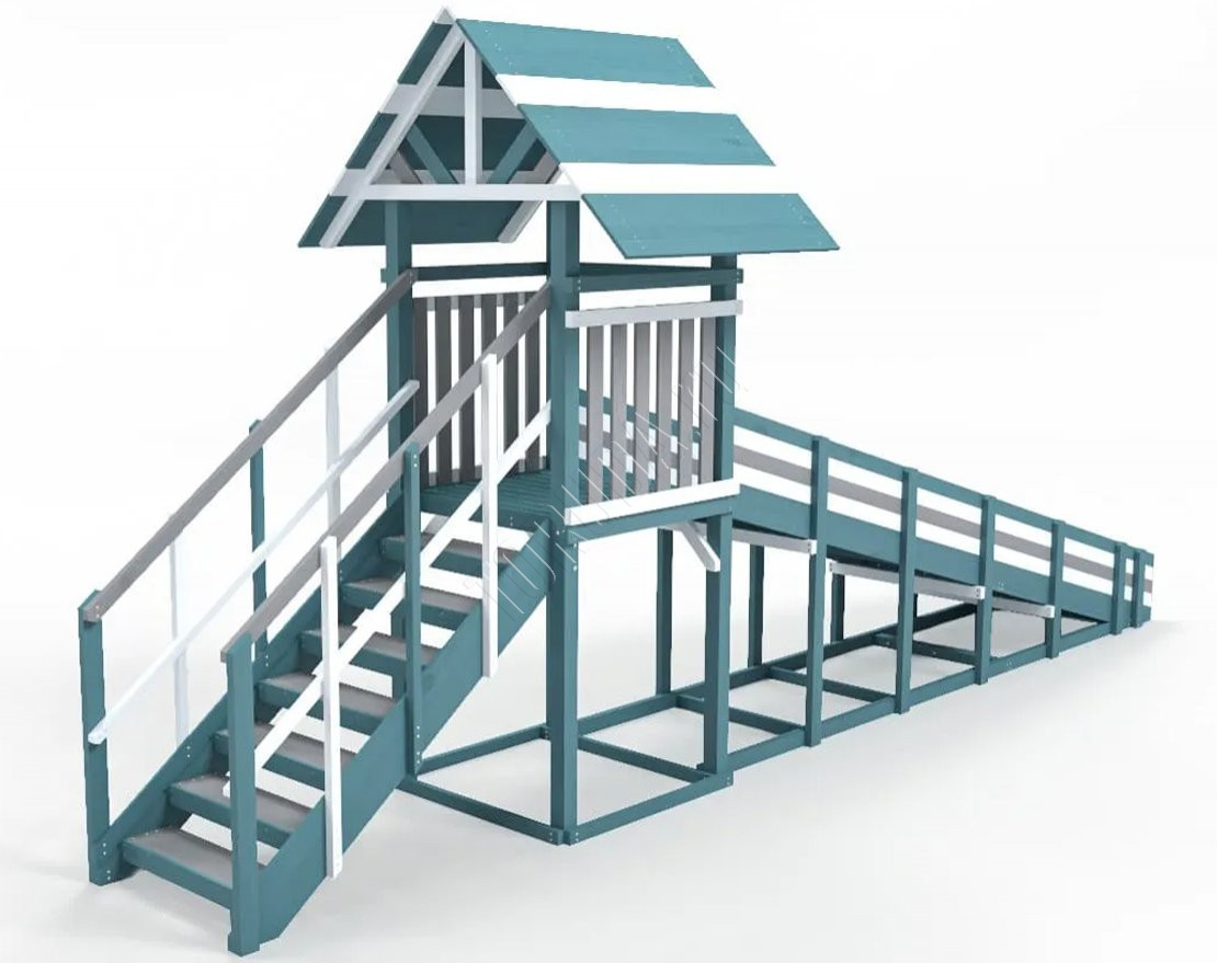 Каркас выполнен из прочного клеёного бруса камерной сушки. Все поверхности тщательно отшлифованы, углы скруглены, а крепежи закрыты заглушками. Деревянная крыша защищает площадку от осадков, а специальное атмосферостойкое покрытие сохраняет древесину в идеальном состоянии.
