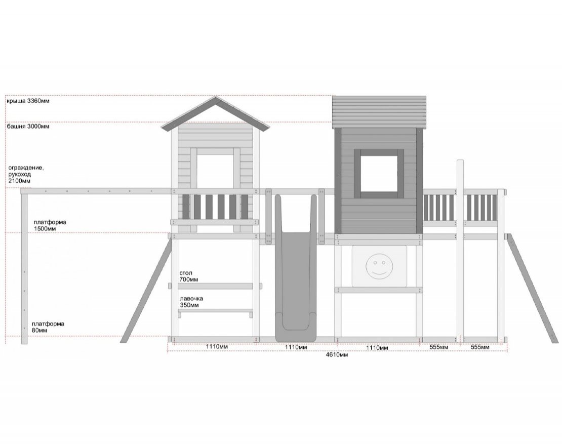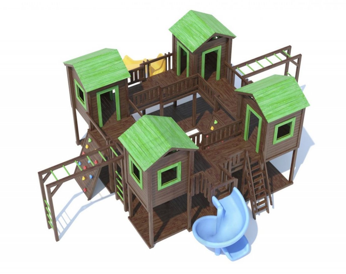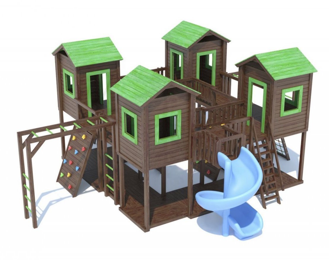 Основа детской игровой - спортивной конструкции – четыре башни с мостами «серия L». Конструкция оснащена четырьмя двухскатными деревянными крышами, встроенным полом, четырьмя встроенными домиками в верхней части конструкции, пластиковым антивандальным скатом с превосходной скользящей поверхностью, антивандальным винтовым скатом с переходным мостиком, двумя «П»-образными деревянными рукоходами, двумя скалодромами, двумя канатными лестницами с армированным канатом, двумя деревянными лестницами. Для безопасности ребенка предусмотрены перила на лестнице, заборчики и ограждения над зонами препятствий (скат).
