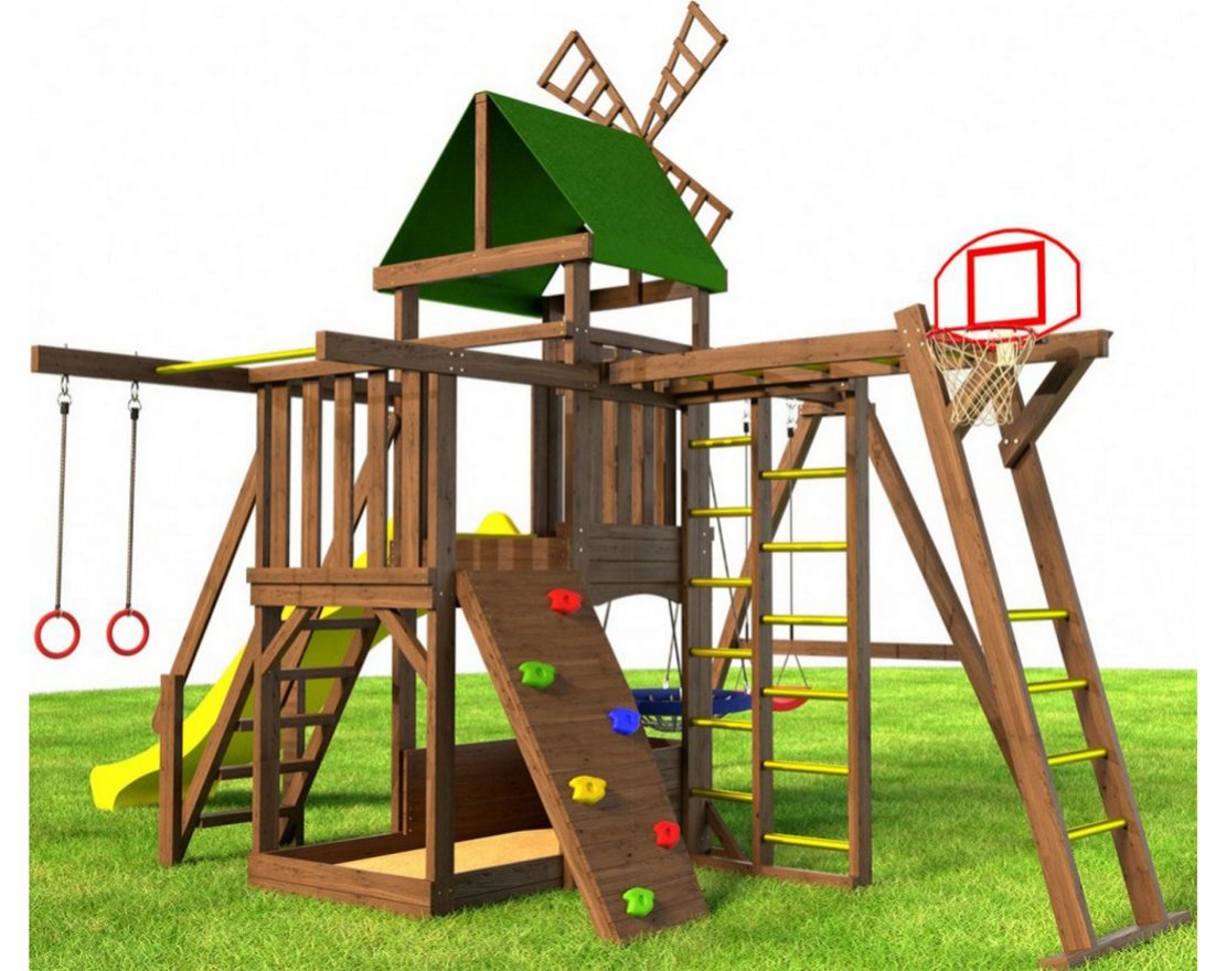 - Спортивной составляющей уделено большое внимание. Конструкция оборудована шведской стенкой, гимнастическими кольцами, баскетбольным кольцом с сеткой, а также модулями «Турник» и «Рукоход».