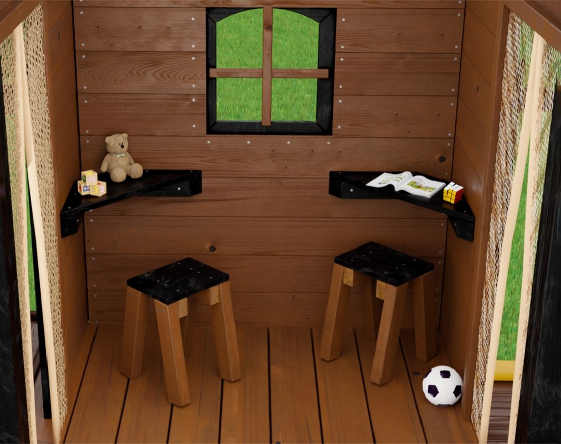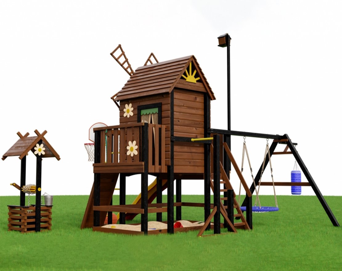 Игровой комплекс Мулен 1 с колодцем — это уютный деревянный домик, наполненный атмосферой приключений. Его узнаваемый силуэт с декоративными лопастями на крыше перенесет детей в мир сказок, где можно представить себя отважным путешественником, хозяином мельницы или капитаном воздушного корабля. Площадка сочетает различные игровые и спортивные элементы, помогая ребенку развивать ловкость, силу и координацию. Лестницы, канаты, качели и горка превращают игру в увлекательное приключение, в котором важно не только фантазировать, но и двигаться. Внутри домика продумано всё до мелочей — каждый уголок наполнен возможностями для игры, творчества и удобства. На втором этаже маленьких художников ждет доска для рисования, где можно воплощать свои фантазии. Два отдельных столика со стульчиками позволяют детям играть, рисовать или устраивать чаепитие, не мешая друг другу. А просторная песочница под домиком станет местом для совместных экспериментов с песочными замками — здесь хватит места всем! Два раздельных входа делают пространство более просторным и удобным, создавая еще больше возможностей для веселой и динамичной игры.