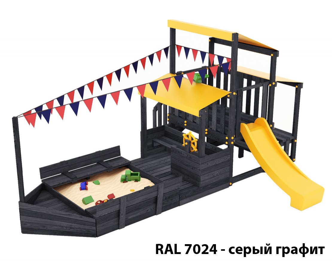 Детская песочница с крышкой-лавочкой и кораблик, включающий в себя штурманскую рубку и капитанский мостик с горкой с высоты 900 мм с флажками.