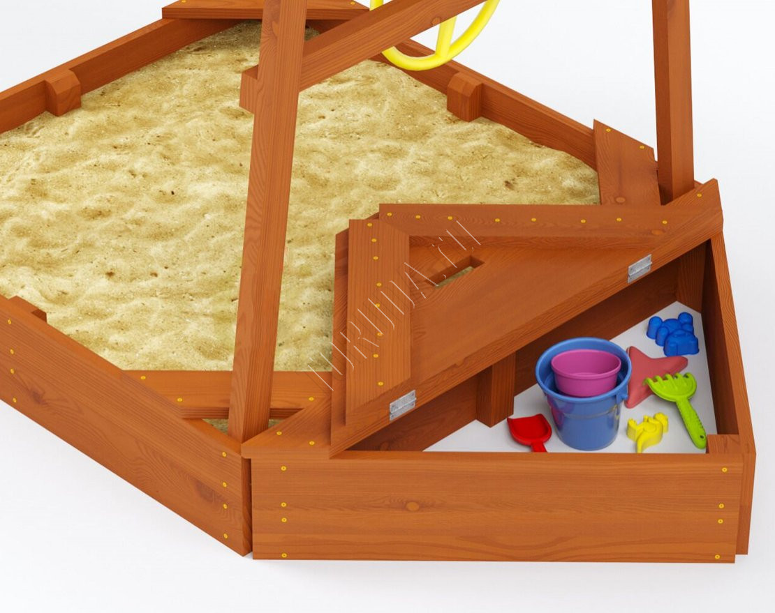 - Песочница, расположенная под корабликом, позволит детям наслаждаться игрой в песке и создавать удивительные замки и фигурки.