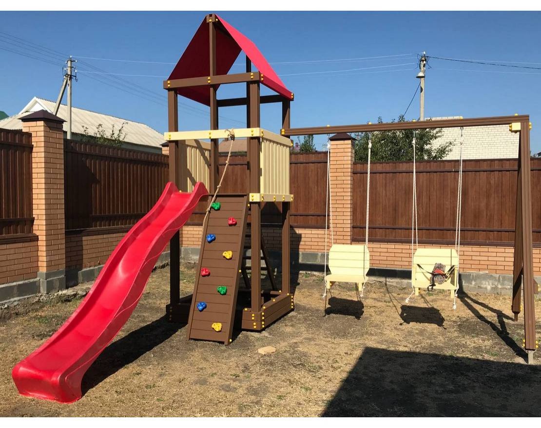 Для максимальной защиты ребёнка от травм, все углы имеют закруглённую форму, крепеж надежно скрыт пластиковыми заглушками. Опоры изготовлены из клееного бруса толщиной 90*90 мм.