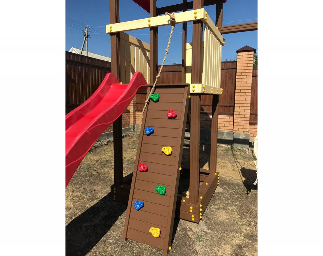 Изделие покрыто безопасной для детей высокоустойчивой краской на водной основе, которая надежно защищает древесину от воздействия окружающей среды. Перила, скалодром и лестница производятся по системе "шип паз".