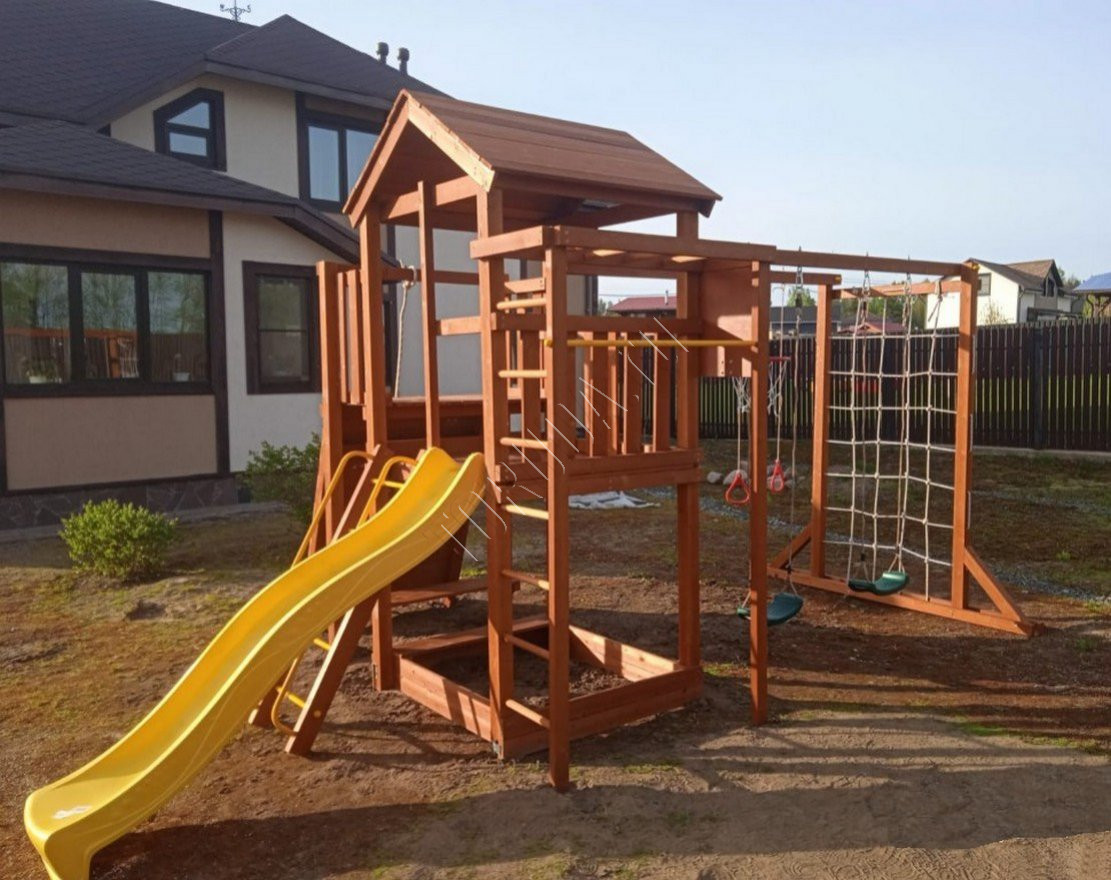 - Безопасность и надёжность: конструкция выполнена из натуральных и экологичных материалов, все соединения надёжно закреплены, а болтовые крепления закрыты пластиковыми заглушками. Это обеспечивает комфортную и безопасную игру на площадке.