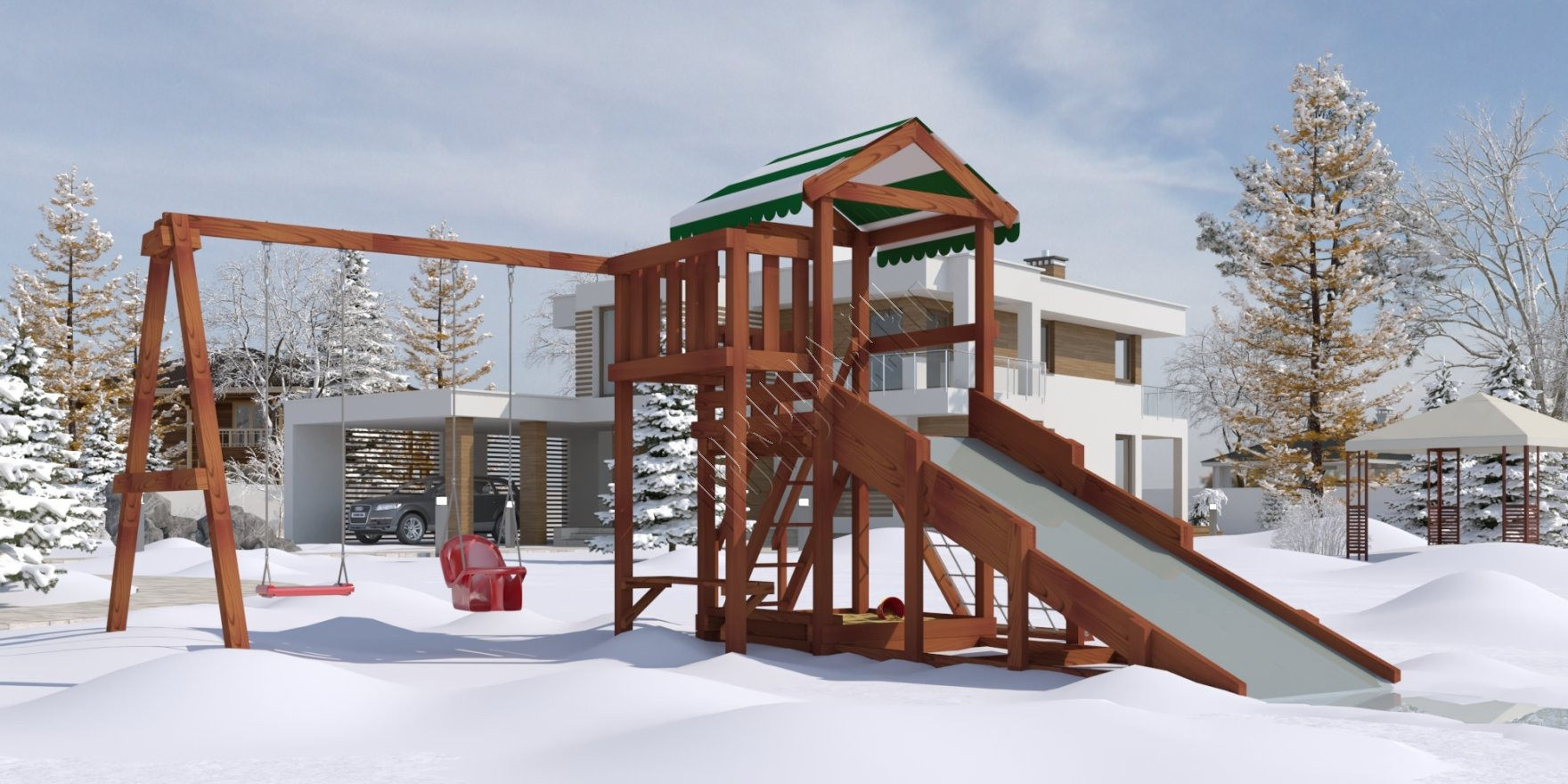 Поднявшись наверх можно поиграть на балкончике, с него будет открываться хороший вид на Ваш дачный участок. А быстро спуститься вниз малышам понравится с горки, цвет пластика на выбор: красный, желтый, зеленый, синий. Под платформой расположена квадратная песочница со сторонами 129 см, где можно более спокойно провести время, а отдохнуть на деревянной лавочке.