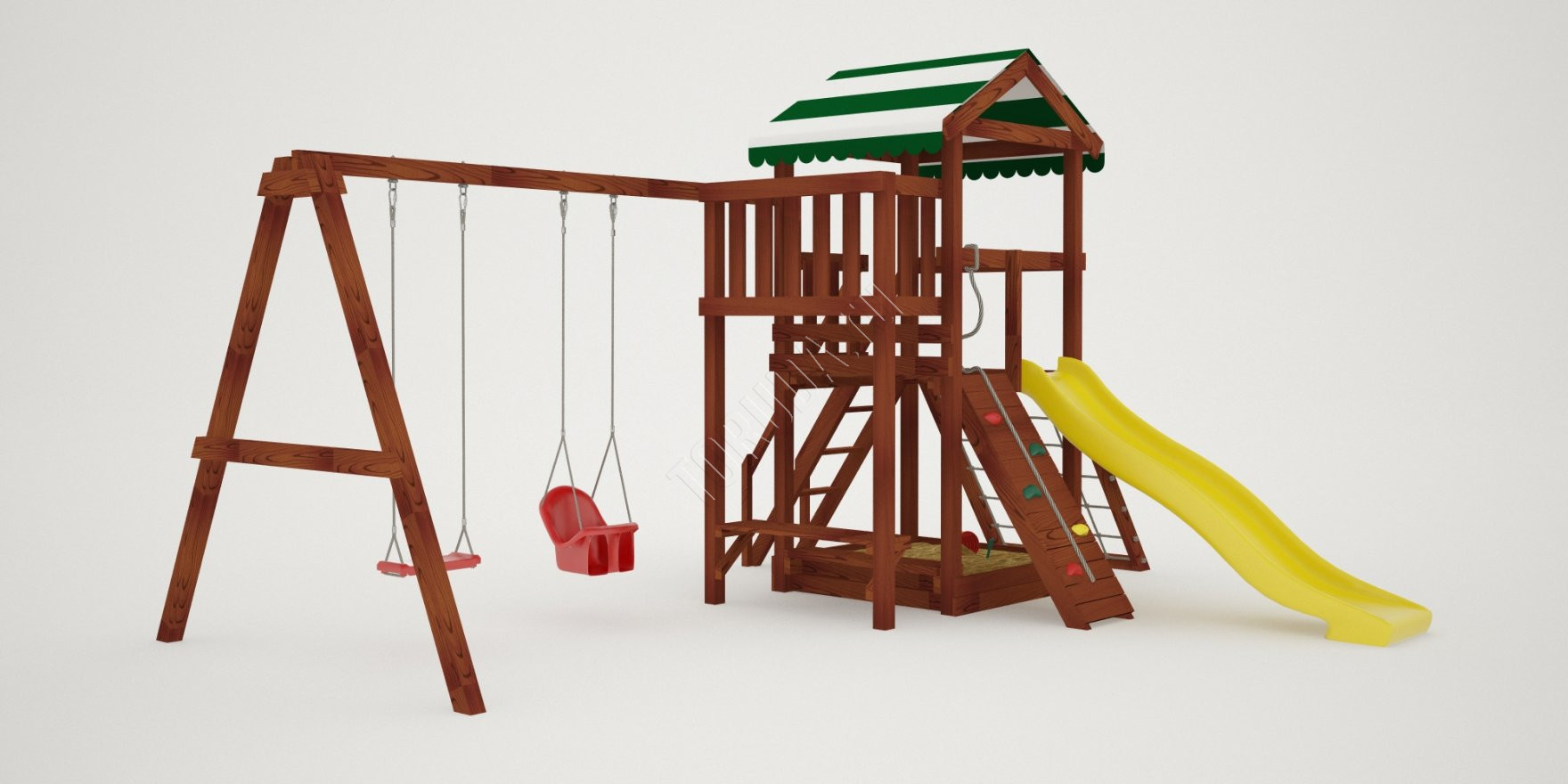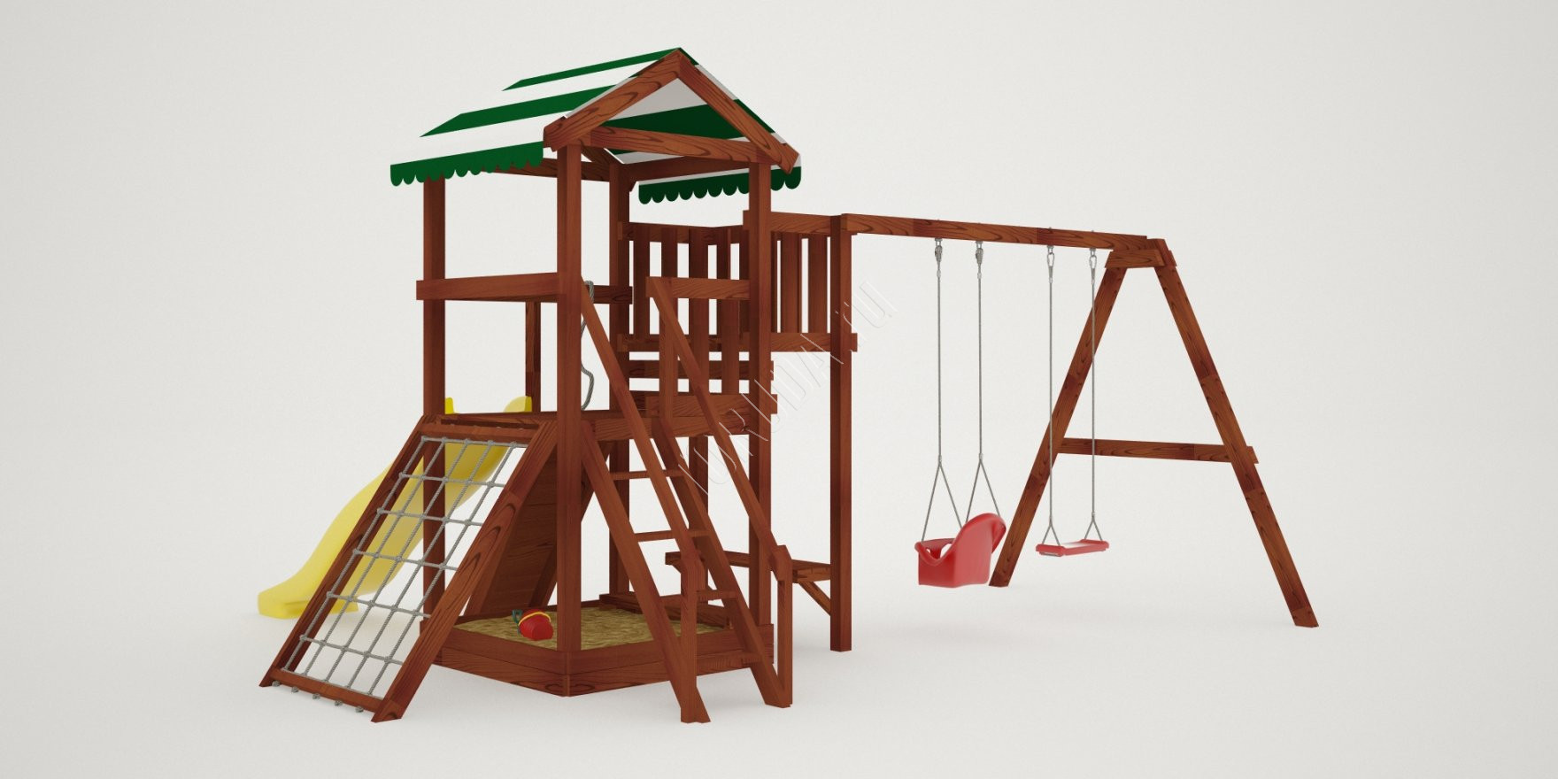Сбоку к башне крепится качельная рама для двух элементов на выбор, например, качели «Лодочка» и «Люкс» со спинкой. Они очень нравятся как маленьким деткам, так и младшим школьникам.