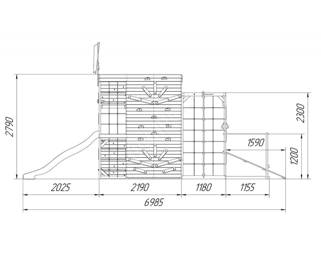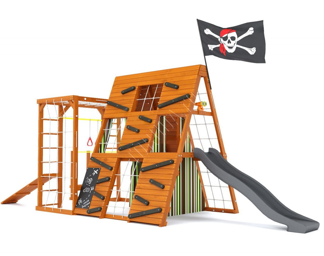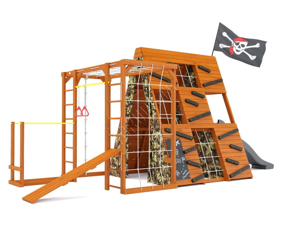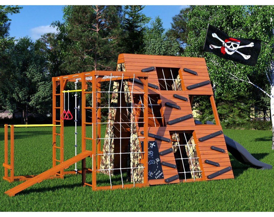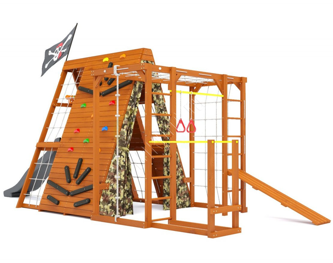 Тематический домик широкого назначения со спортивно-игровыми функциями, внутренняя игровая площадь которого составляет 3,6 кв. метра, а комплект распашных занавесов с подхватами придаст вашему домику уютный и защищённый вид.