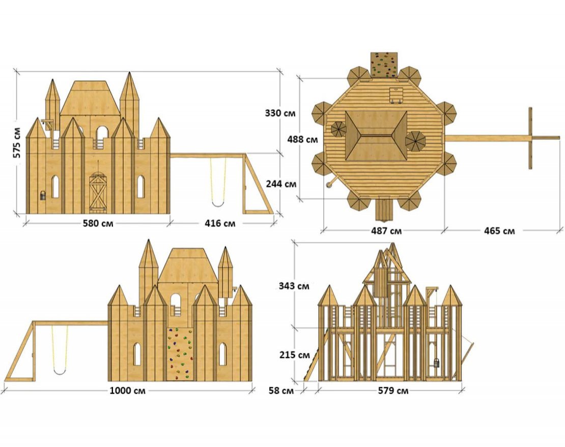 Если вы хотели выбрать самый большой и лучший замок, то это он. Королевский дворец имеет внушительную площадь. Восемь башен окружают замок, еще две асимметрично расположены с каждой стороны замка. Двухэтажный игровой комплекс Королевский дворец имеет два люка-ловушки, скалодром, крепление для качелей и горка.