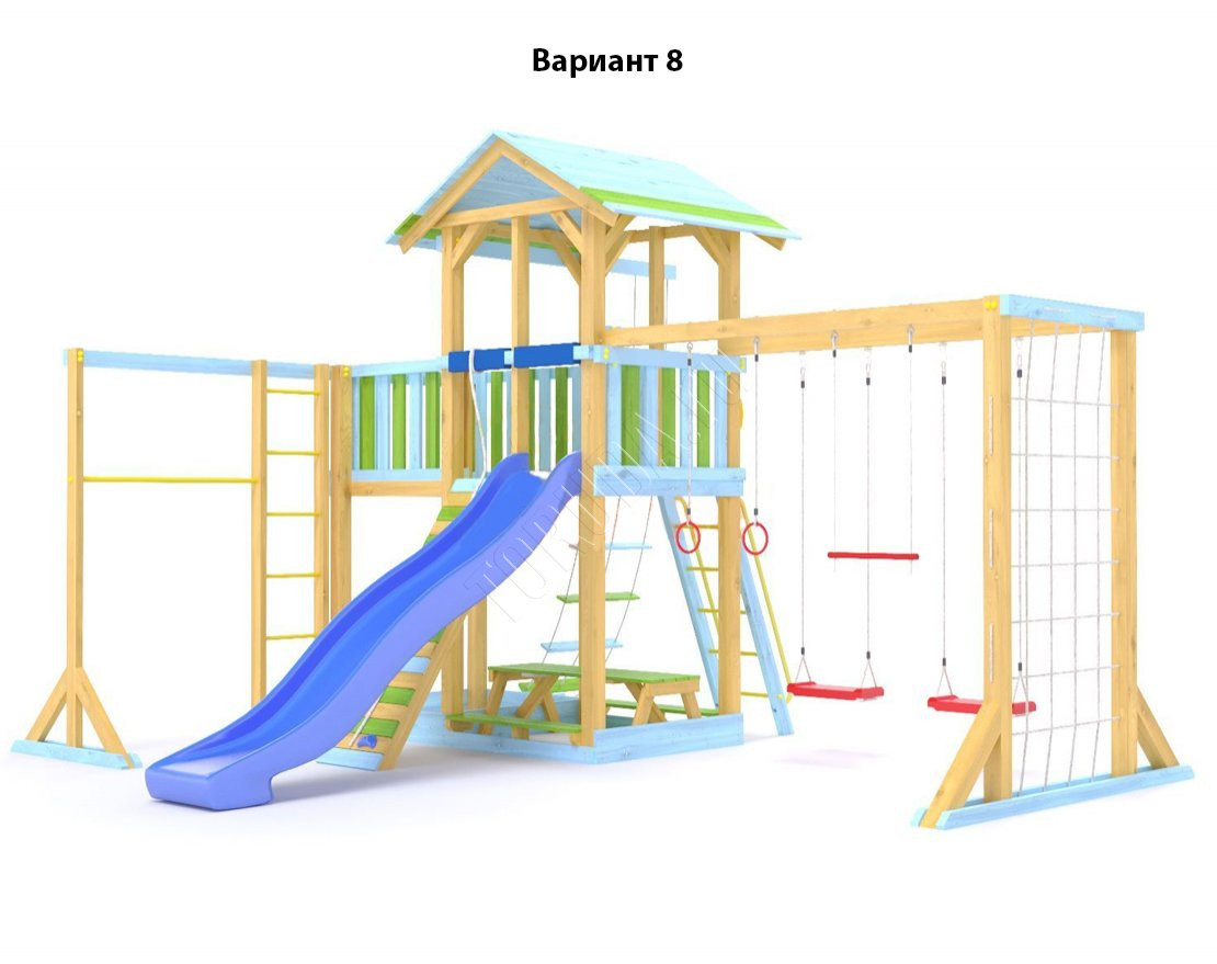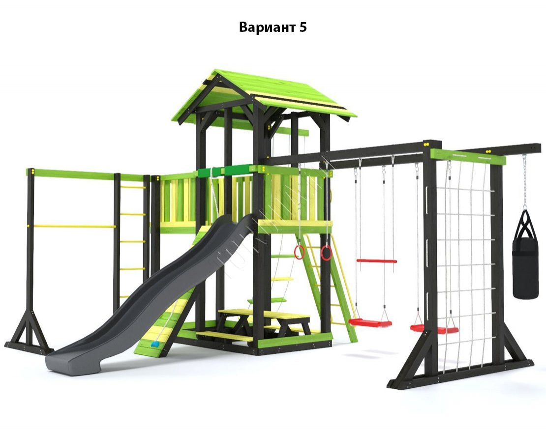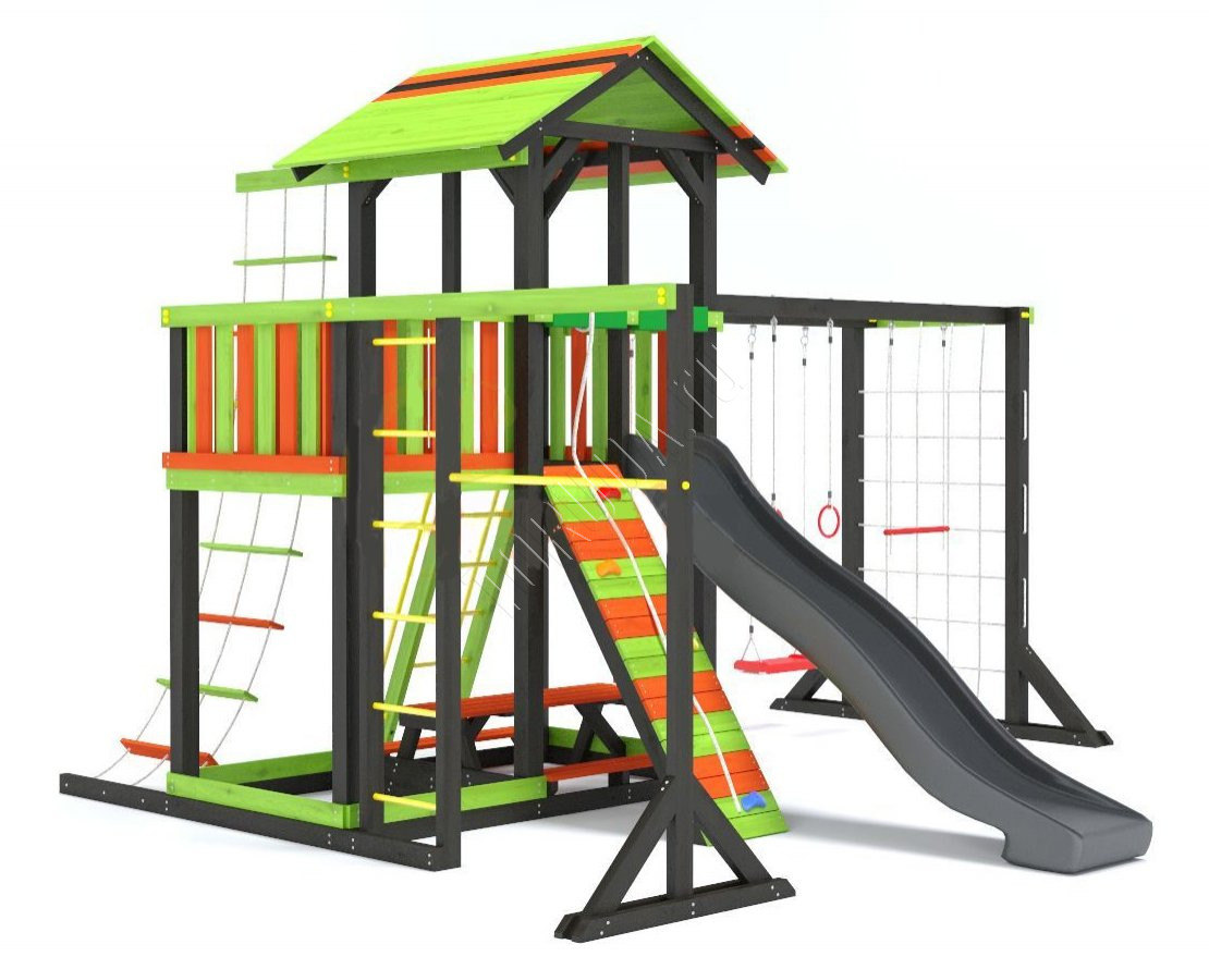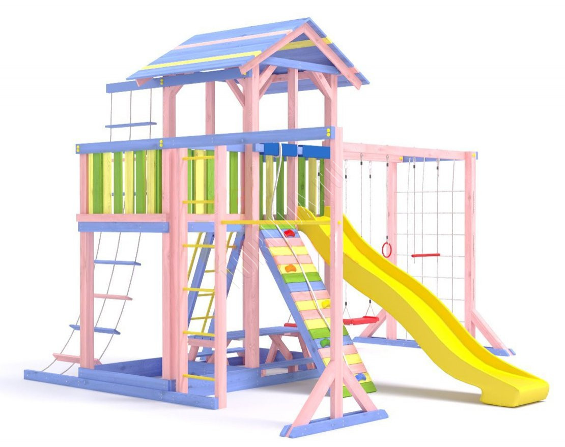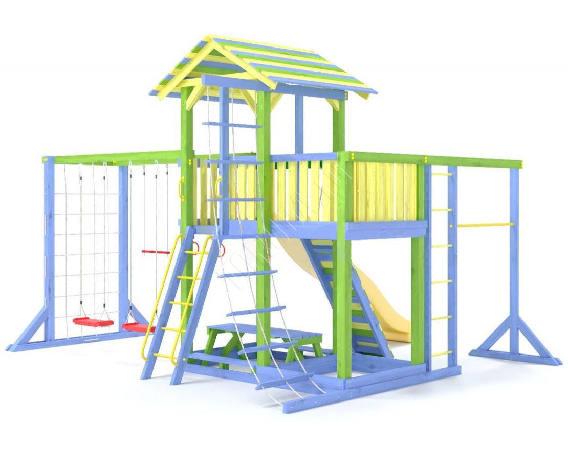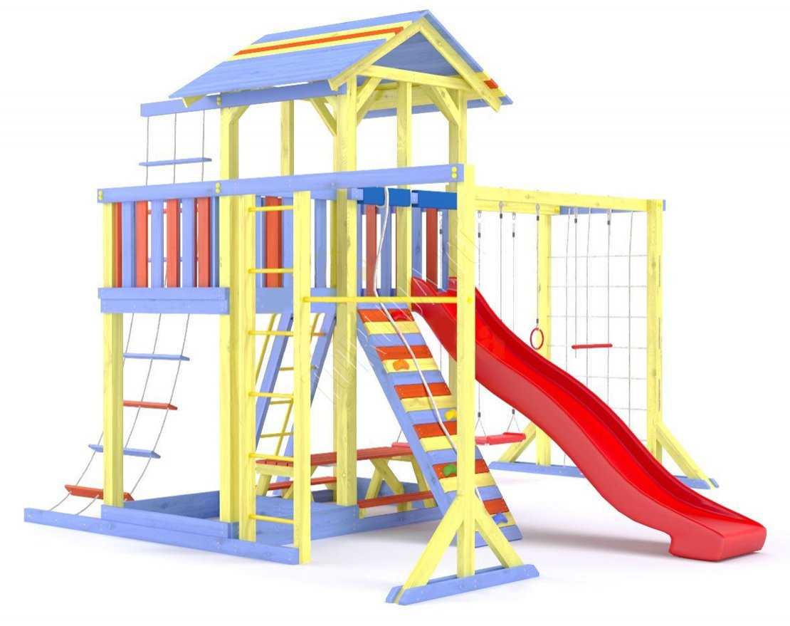 - Комплектующие игровой площадки изготовлены из всесезонного пластика и клееного бруса повышенной прочности, что обеспечивает полную безопасность и вместе с тем прочность и долговечность конструкции.