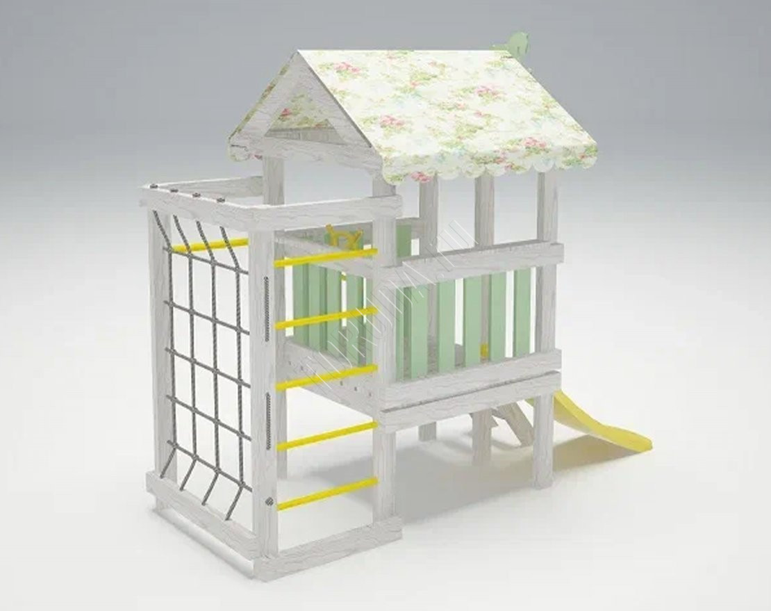 - В игровой зоне на платформе (60 см от пола) расположен домик с крышей. Зайти внутрь ваш ребёнок сможет по удобной, прочной лестнице. Внутри установлен руль-штурвал. Наигравшись наверху, малыш может спуститься обратно вниз, скатившись по яркой пластиковой горке или воспользовавшись лестницей.