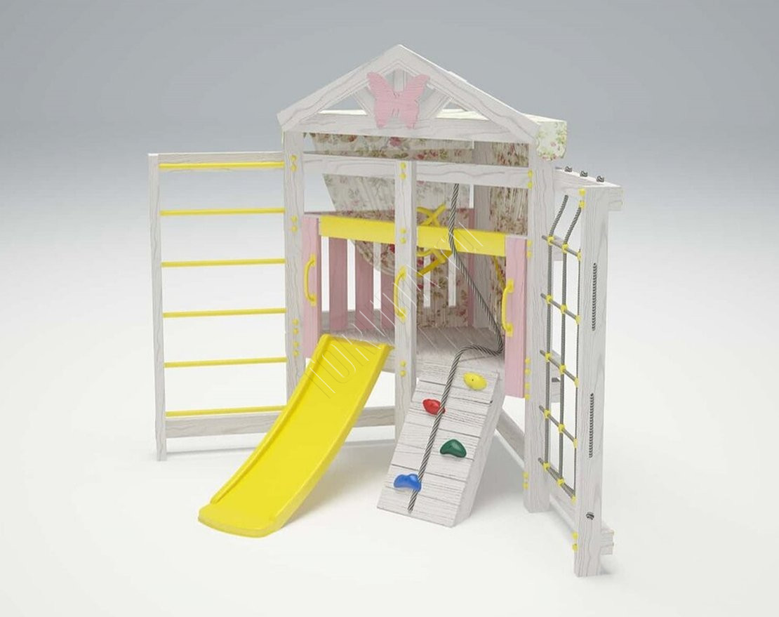 Спортплощадка поместится даже в маленькие детские комнаты. Её основа – игровая башня, по бокам от которой установлено спортивное оборудование. Домик стоит на платформе высотой 0,6 метра. Чтобы попасть внутрь, нужно преодолеть скалодром с разноцветными выступами и канатом.