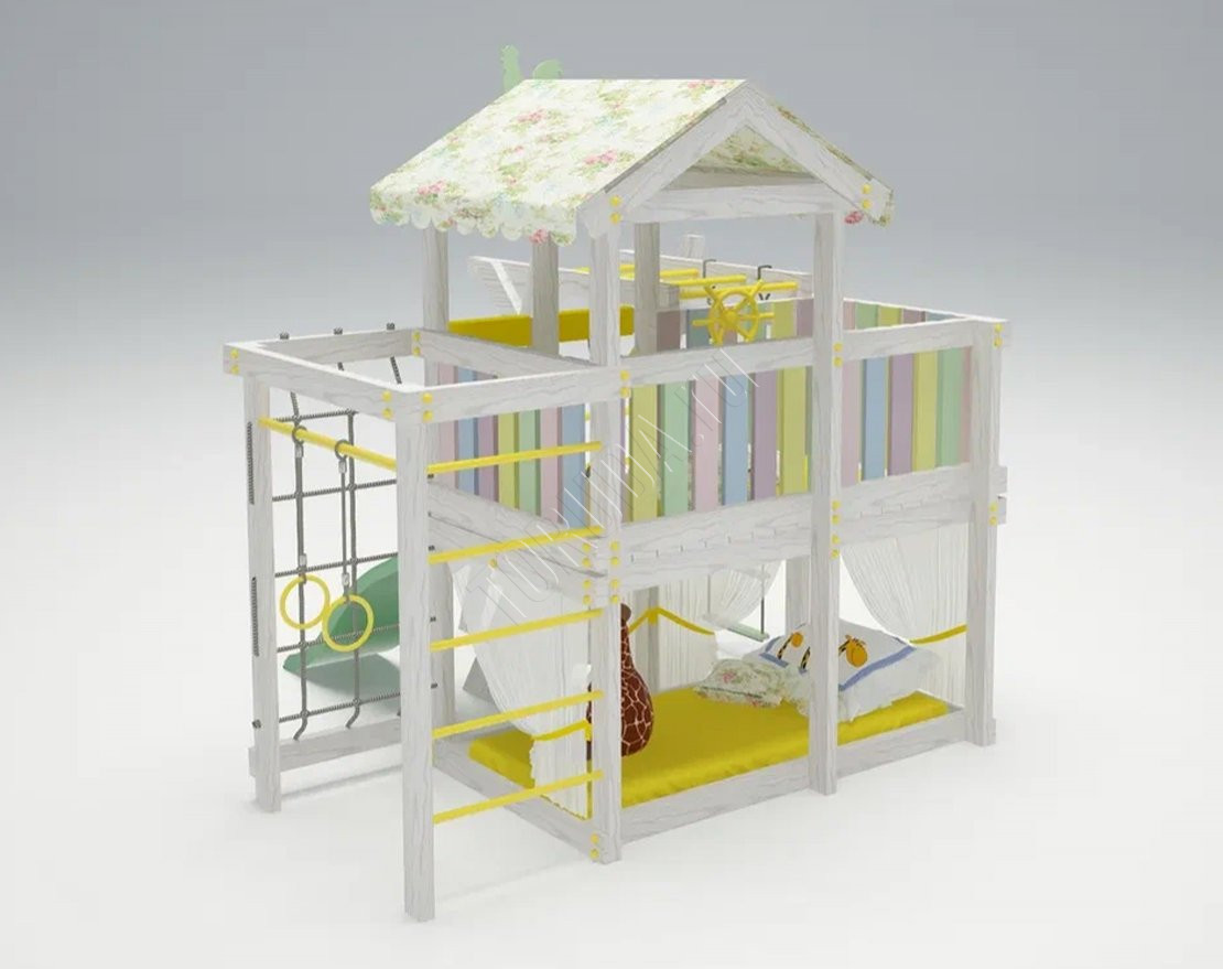 Модель оснащена спортивным оборудованием от ведущих бельгийских производителей. Включает две игровые зоны на разных уровнях, балкон с биноклем и штурвалом. Также в комплекте имеется пластиковая горка, которая всегда вызывает восторг у детей.