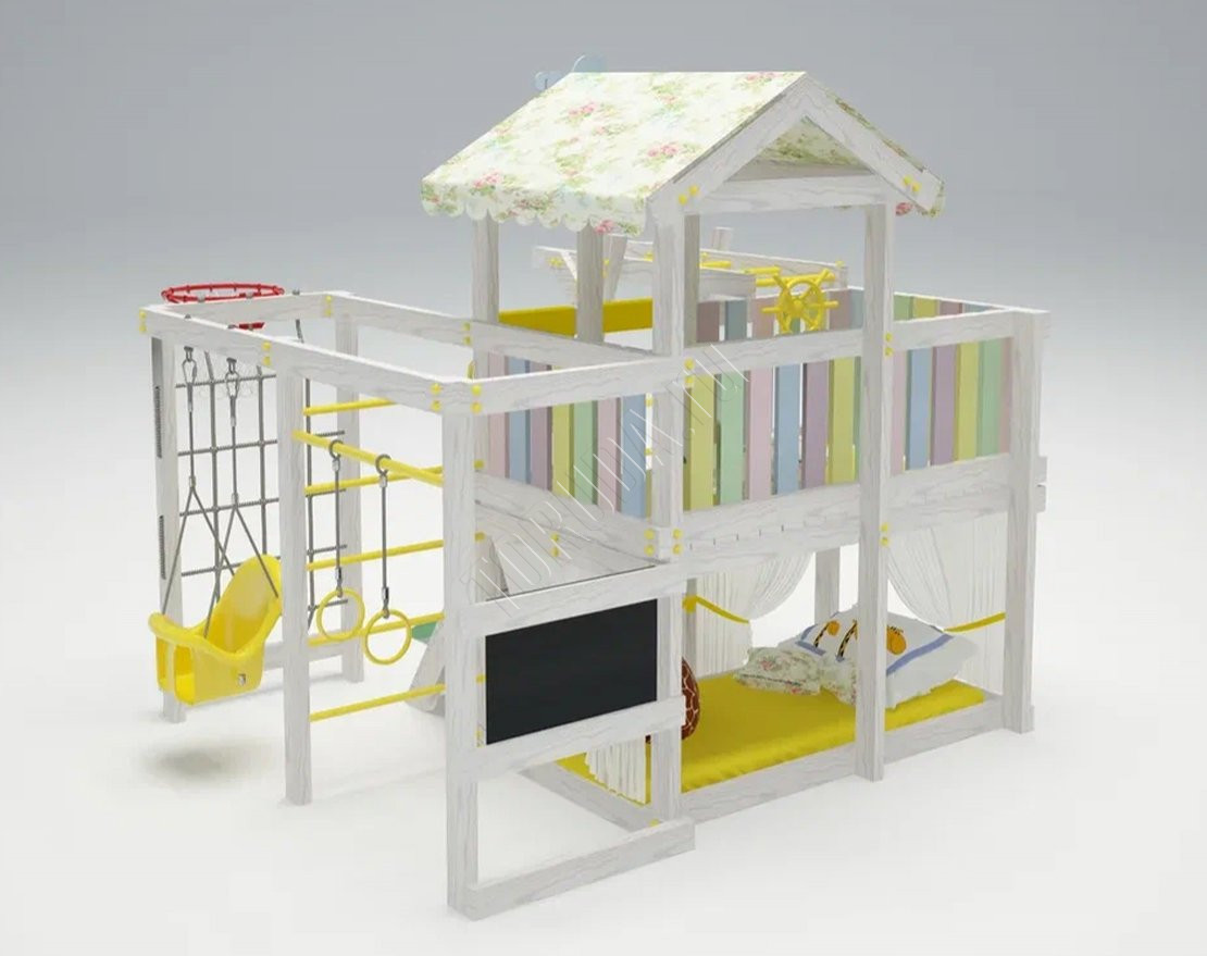 Чтобы разнообразить развлечения, предусмотрены 2 игровые зоны наверху и внизу, домик под крышей и балкон. И полный комплект спортивного инвентаря, включающий шведскую стенку, сетку, детский турник, гимнастические кольца, скалодром.