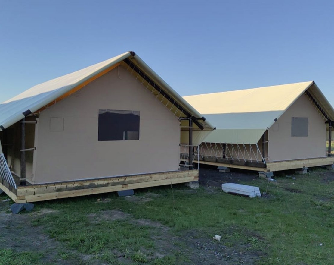 Сафари-тент — это комфортная палатка для глэмпинга, вмещающая от 1–2 до 4–6 человек. Представляет собой конструкцию на основе деревянного или металлического каркаса с двускатным навесом из ткани ПВХ и палаткой из износостойкой ткани Оксфорд , покрытие выдерживает температуру от -50°С до +70°С.
